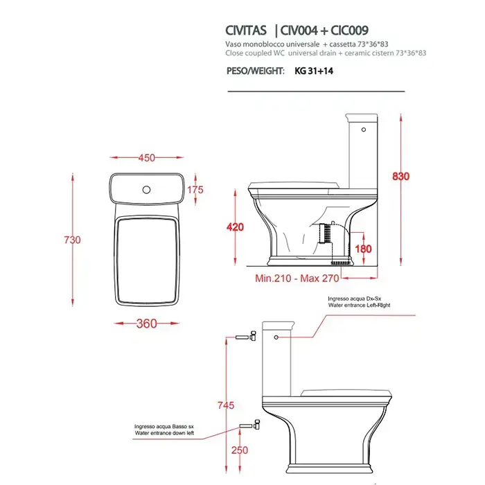 Artceram Civitas Унитаз моноблок 36x54 см, слив универсальный, цвет: белый, фурнитура хром