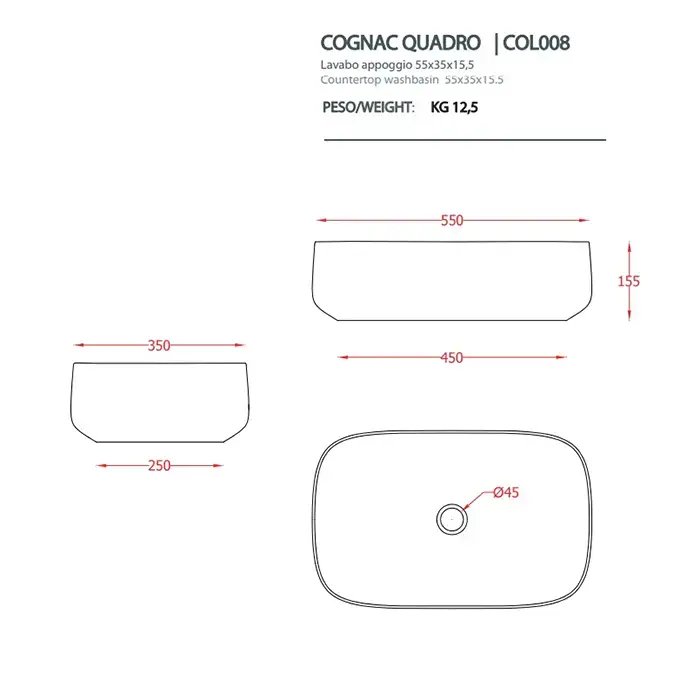 Artceram COGNAC Раковина накладная Quadro 55x35хр15,5см, без отв под смеситель, без перелива, цвет: черный глянцевый