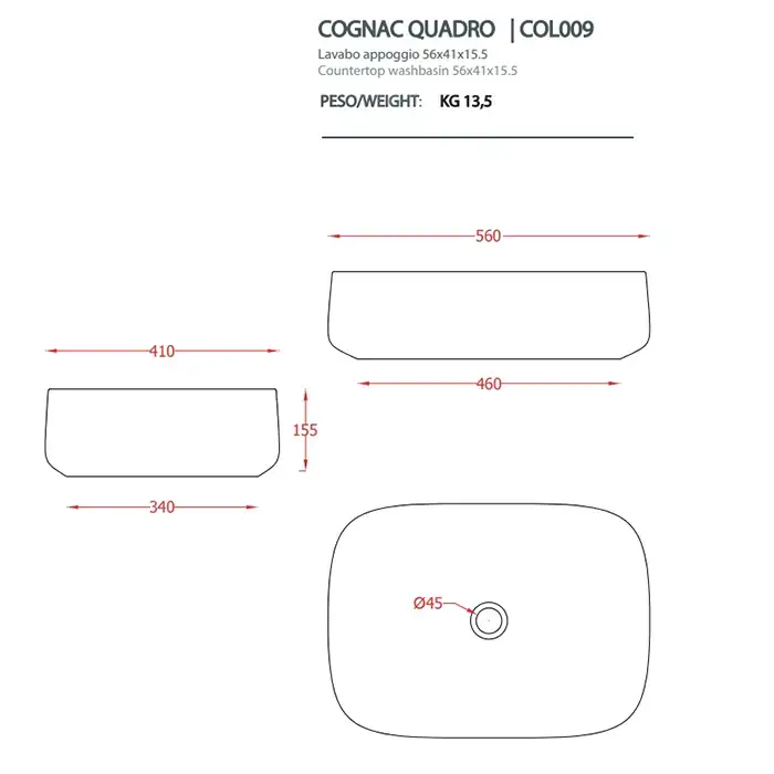 ARTCERAM COGNAC Раковина настольная Quadro 56x41 см, цвет белый глянец, покрытие Saniglaze