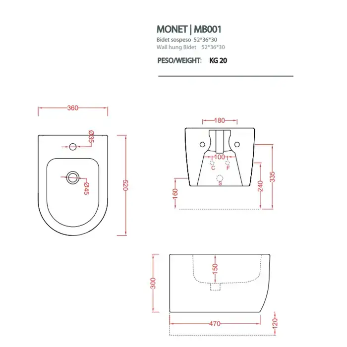 Artceram Monet Биде подвесное 36х52 см, 1 отверстие, цвет: белый