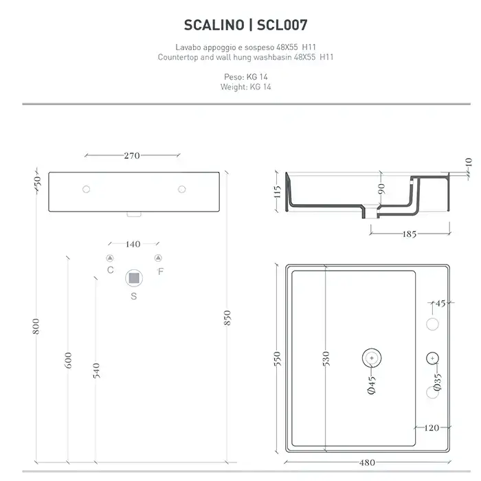 Artceram SCALINO Раковина 38х55 см, без отв., накладная, без слив-перелива, цвет: белый