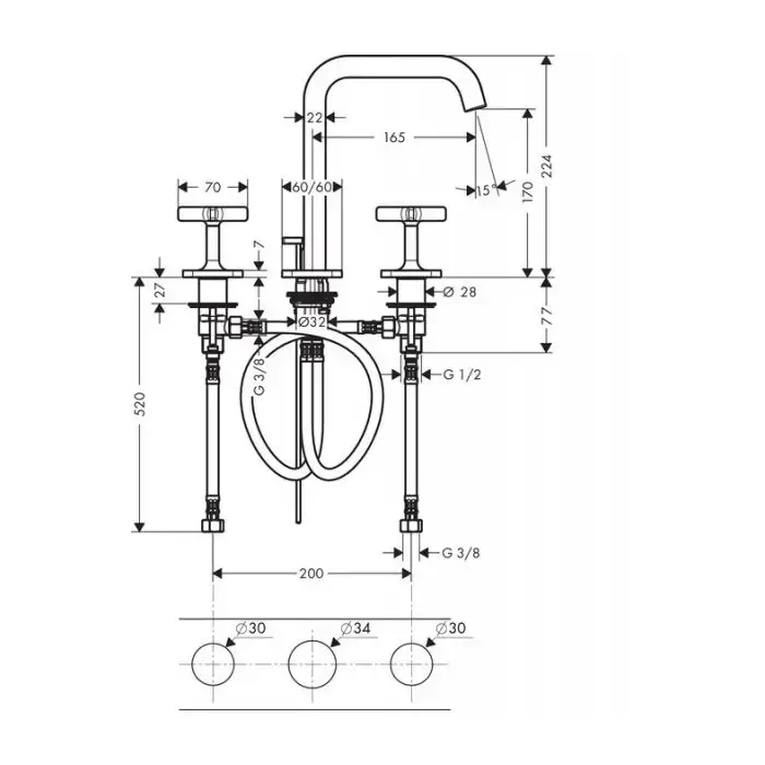 AX Citterio E Смеситель для раковины 170, на 3 отв., излив 165мм, с розетками, с донным клапаном (рук. форма звезд), цвет: хром