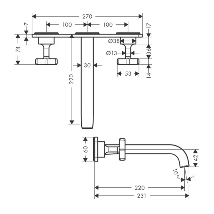 Axor Citterio E, Смеситель для раковины, на 3 отверстия, с розетками и изливом 220 мм, настенный монтаж, СМ, цвет: хром