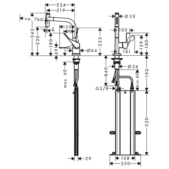 Axor Citterio Смеситель для кухни, однорычажный, на 1 отв, с выдвижным душем, излив: 219мм, цвет: под сталь