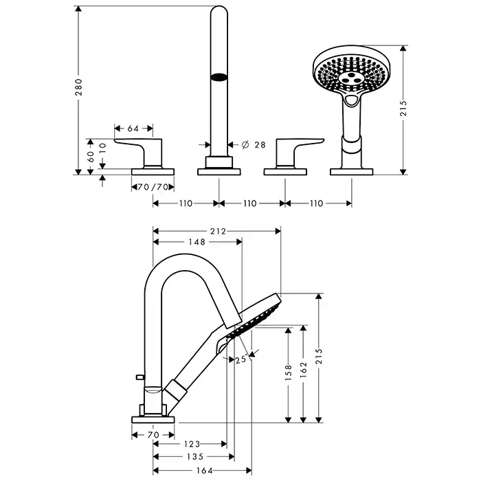 Axor Citterio M Смеситель на борт ванны, на 4 отв., с ручным душем, цвет: полированное золото