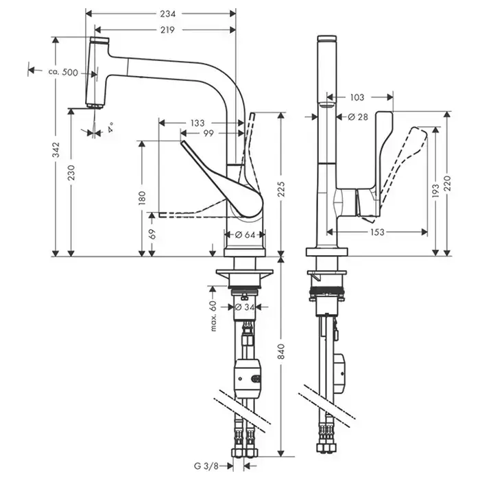 Axor Citterio Смеситель для кухни, однорычажный, на 1 отв, с выдвижным душем, излив: 219мм, цвет: под сталь