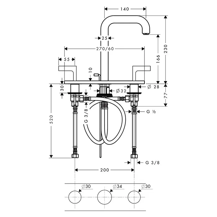 Axor Citterio Смеситель для раковины 170, на 3 отв., ручка: рычаг, с панелью, с донным клапаном, цвет: сталь