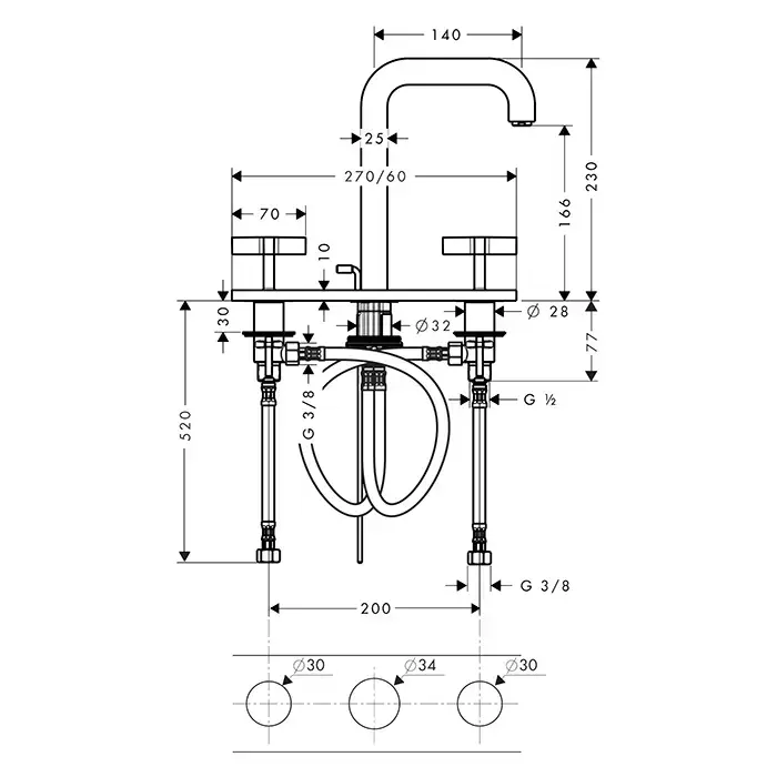 Axor Citterio Смеситель для раковины 170, на 3 отв., с панелью, с донным клапаном, цвет: полированное золото