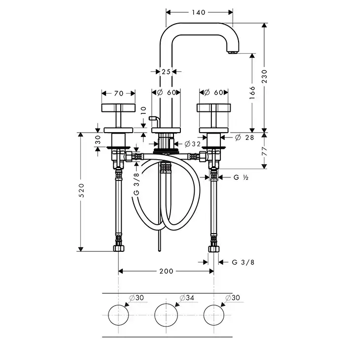 AX Citterio Смеситель для раковины 170, на 3 отв., излив 140мм, с розетками, с донным клапаном (крест рук.), цвет: красное золото
