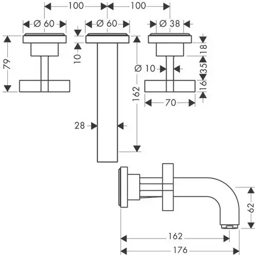 Axor Citterio, Смеситель для раковины, на 3 отверстия, с крестовыми рукоятками, розетками и изливом 162 мм, настенный монтаж, СМ, внешняя часть, цвет: хром