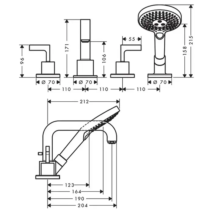 AX Citterio Смеситель на борт ванны, на 4 отв., с рычаговыми рукоятками, с ручным душем,(внешняя часть), цвет: хром