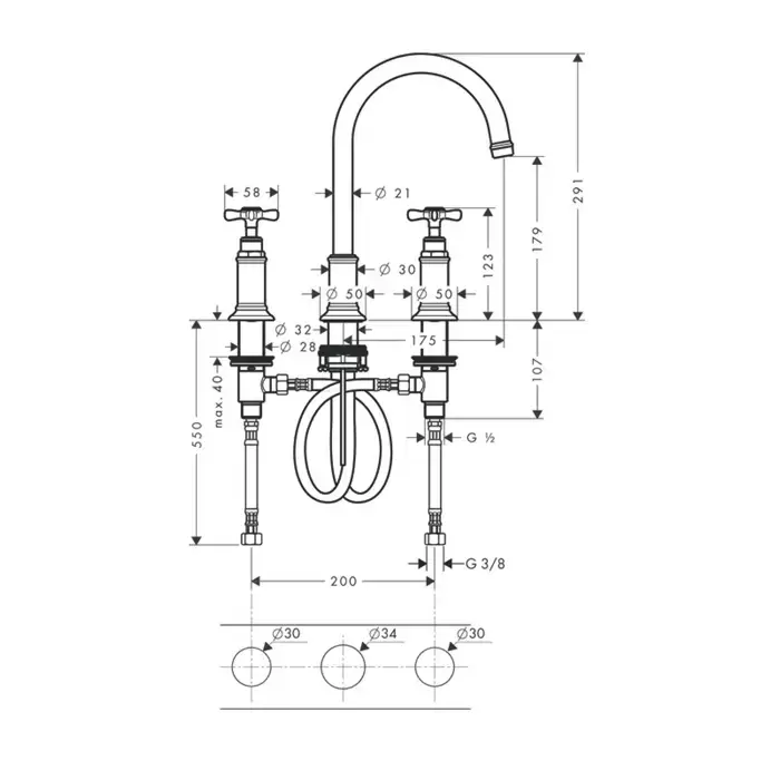 Axor Montreux Смеситель для раковины 30, на 3 отв., с донным клапаном, цвет: шлифованная бронза