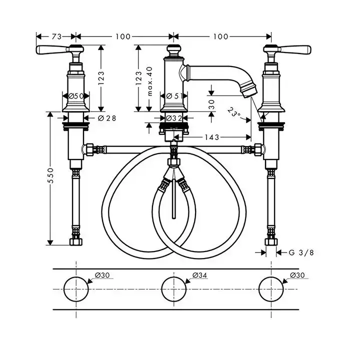 Axor Montreux, Смеситель для раковины 30,на 3 отверстия, с рычаговымирукоятками, с донным клапаном, цвет: хром