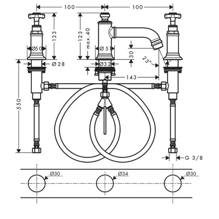 Axor Montreux Смеситель для раковины 30, на 3 отв., с донным клапаном, цвет: полированный черный хром