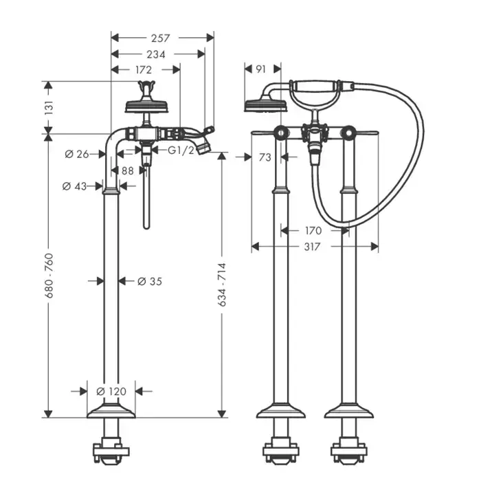 Axor Montreux, Смеситель для ванны, с двумя рычаговыми рукоятками, напольный, внешняя часть, цвет: никель шлифованный
