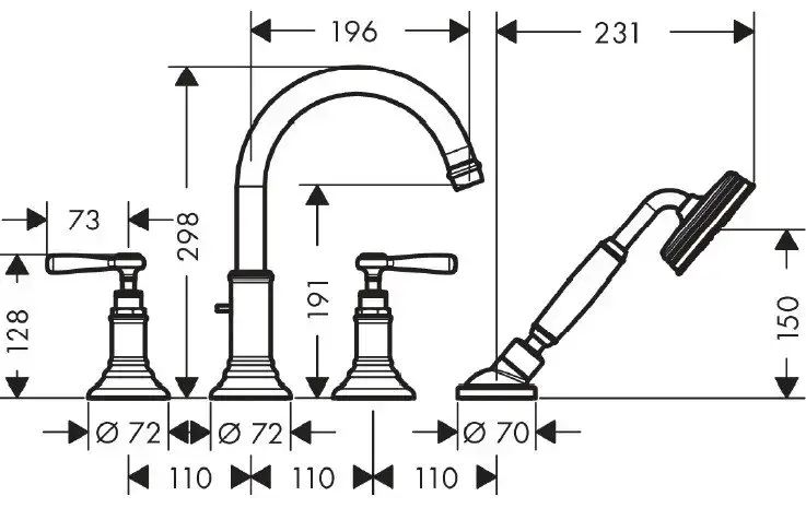 AX Montreux Смеситель на борт ванны, на 4 отв., с рычаговыми рукоятками, с ручным душем,(внешняя часть), цвет: хром