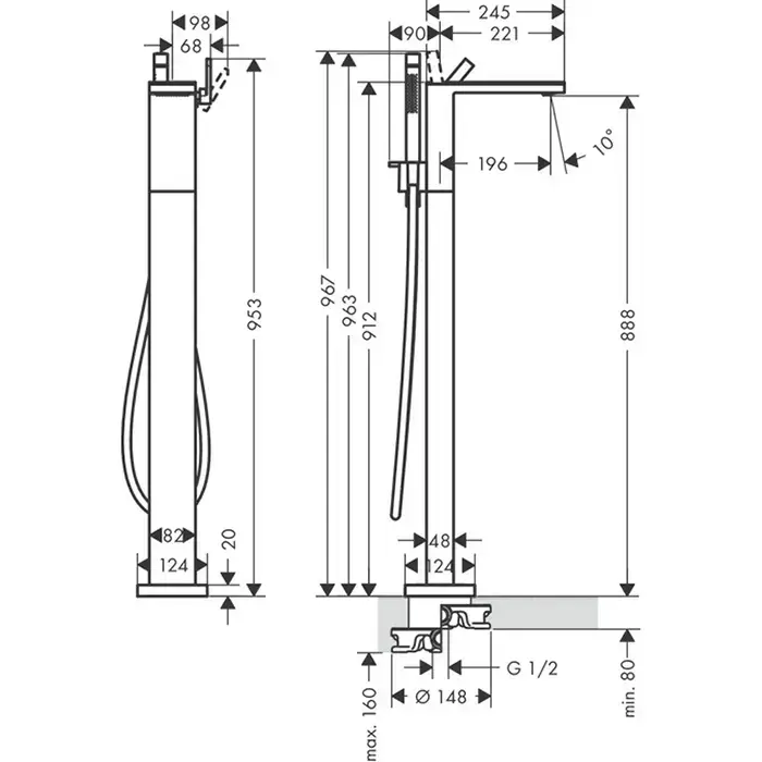 Axor MyEdition Смеситель для ванны, напольный, с ручным душем, без панели, цвет: сталь