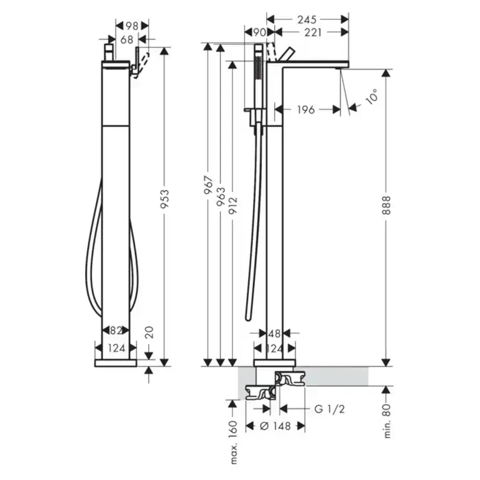Axor MyEdition Смеситель для ванны, напольный, с ручным душем, без панели, цвет: сталь