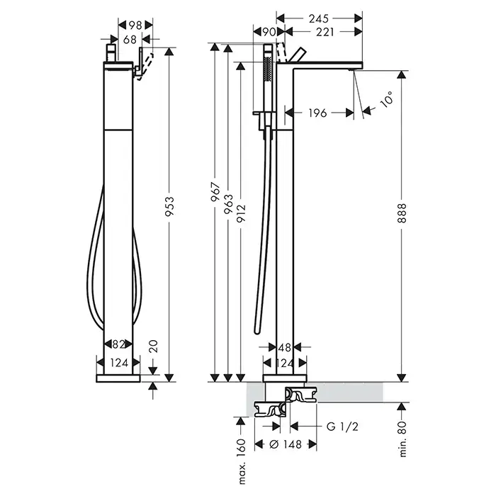 Axor MyEdition Смеситель для ванны, напольный, с ручным душем, без панели, цвет: сталь