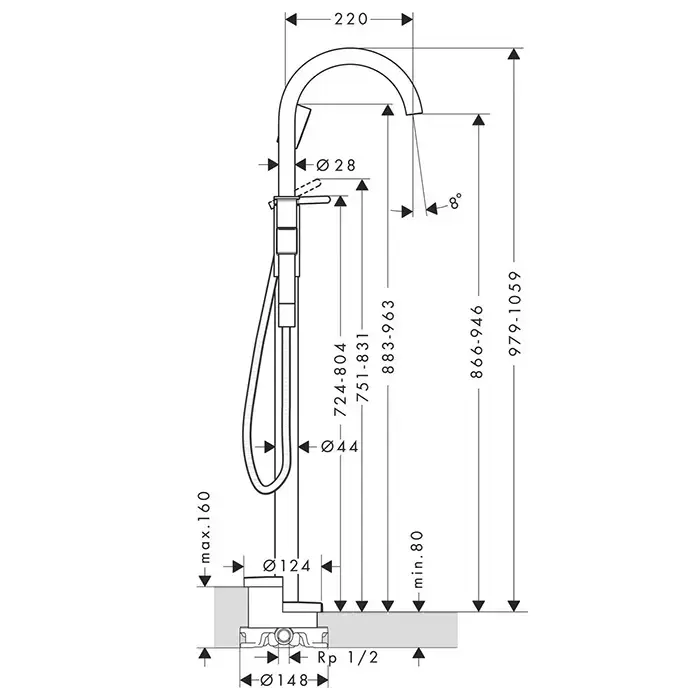 Axor One Смеситель для ванны, напольный, с душевым гарнитуром, внешняя часть, цвет: хром