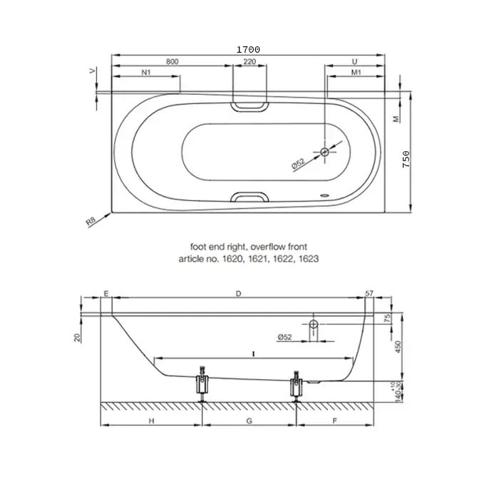 BETTE Comodo Ванна 170х75х45 с шумоизоляцией, с покр. BetteGlasur ® Pl , область ног ванны справа, перелив сзади (для удлиненного слив-перелива) белая