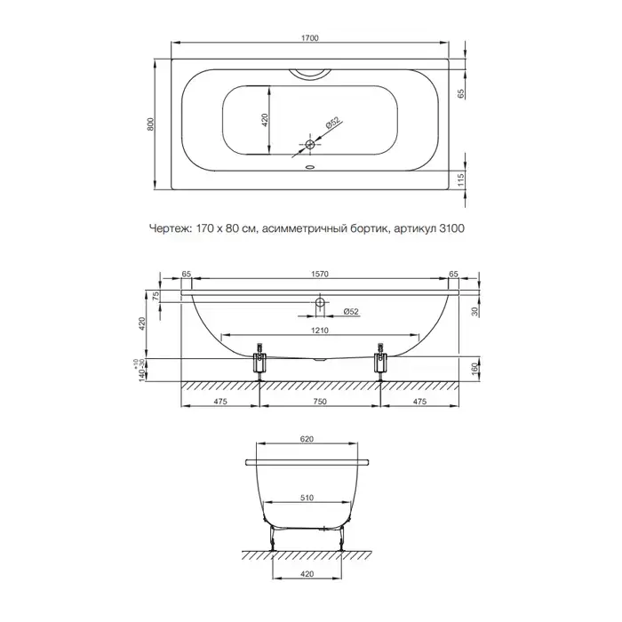 Bette Form 2020 Ванна с шумоизоляцией 170х75х42см, BetteGlasur® Plus, с комплектом ножек, встраиваемая, цвет: белый