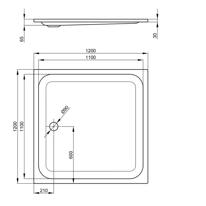BETTE Душевой поддон квадратный 120х120хh6,5см с отв-м слива d90мм цвет белый