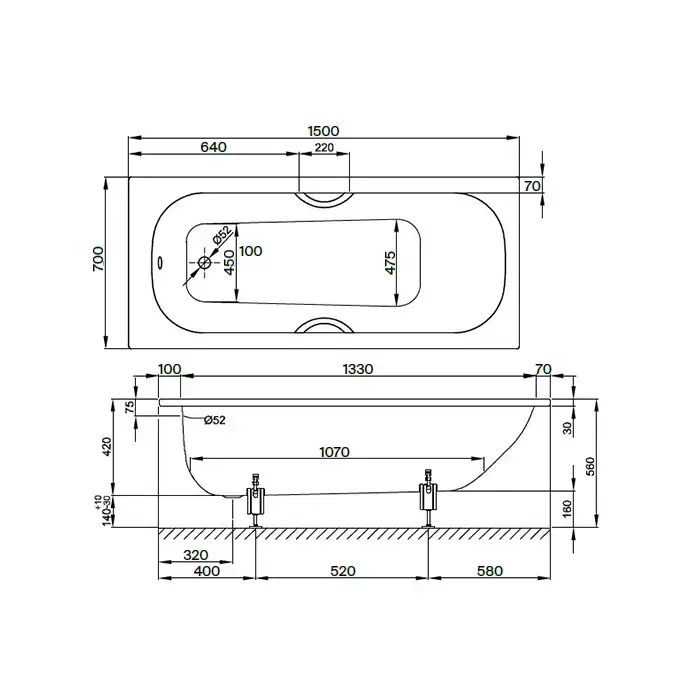 BETTE Form 2020 Ванна 1500х700х420 мм, с шумоизоляцией, BetteGlasur® Plus,BetteАнтислип, цвет белый (для стандартного слива-перелива)