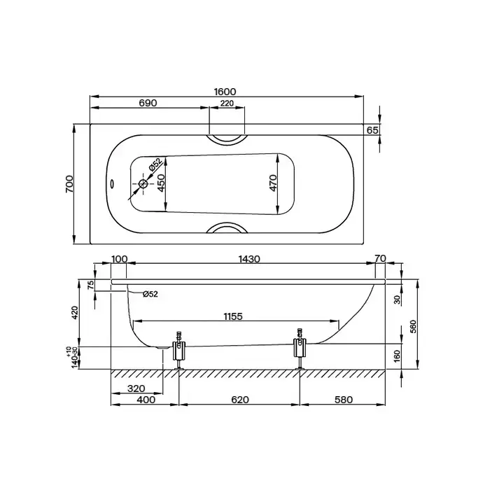 BETTE Form 2020 Ванна 1600х700х420 мм, с шумоизоляцией, BetteАнтислип Sense, цвет белый (для стандартного слива-перелива)