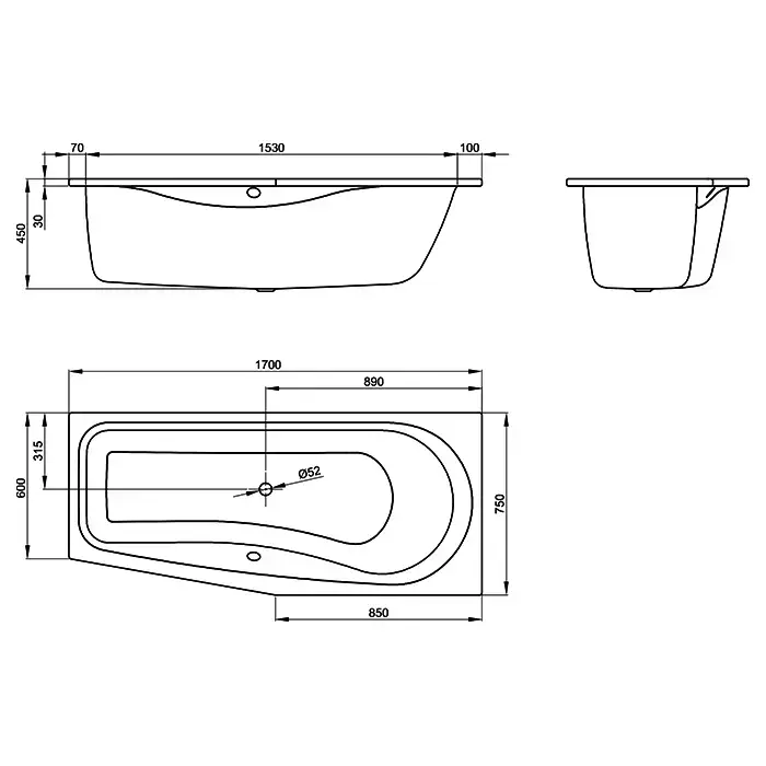 Bette Luna Ванна прямоугольная с шумоизоляцией 170х75/60х45 см, (область ног слева)(для удлин слива-перелива) цвет: белый +покрытие BetteGlasur® Plus