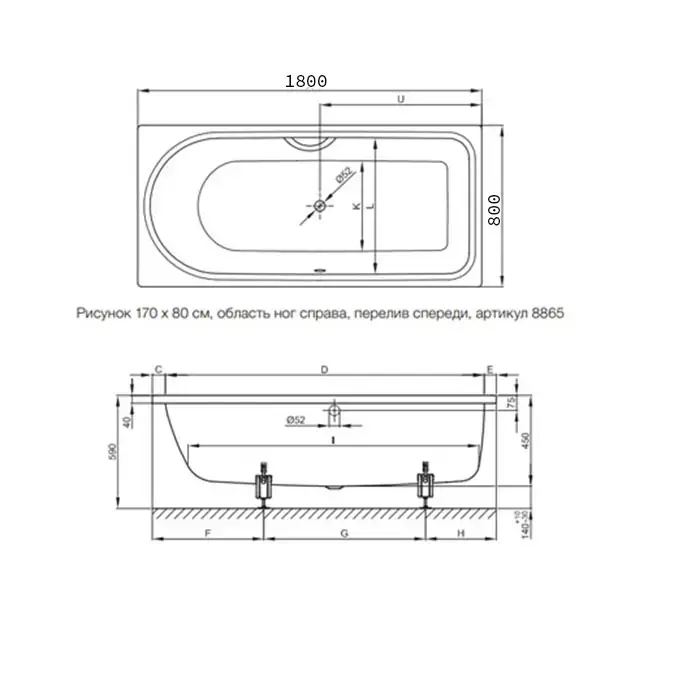 BETTE Ocean Ванна с шумоизоляцией 180х80х45, перелив спереди, BetteGlasur ® Plus , белая (для удлиненного слива-перелива)