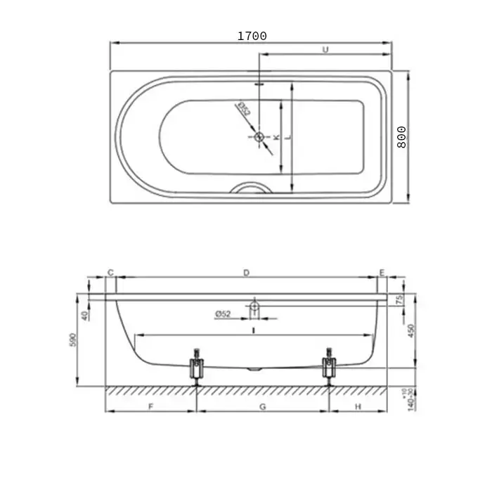 Bette Ocean Ванна с шумоизоляцией пристенная, 170х80х45см, перелив спереди, с комплектом ножек, цвет: белый