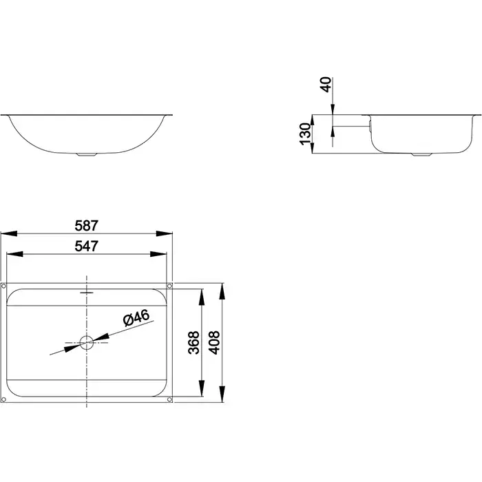 BETTEONE Раковина встраиваемая под столешницу 587х408х130 мм, с шумоизоляцией без отв.под смесит. с переливом.