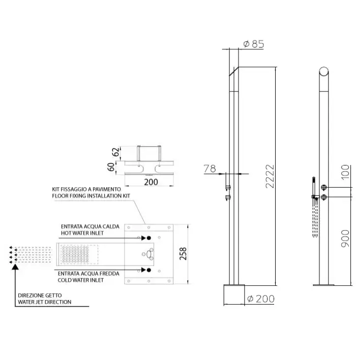 BOSSINI AQUABAMBU Душевая колонна для установки вне помещения, напольная, 2 прогрессивн смесителя, каскад, ручной душ, с встроенной частью, цвет хром
