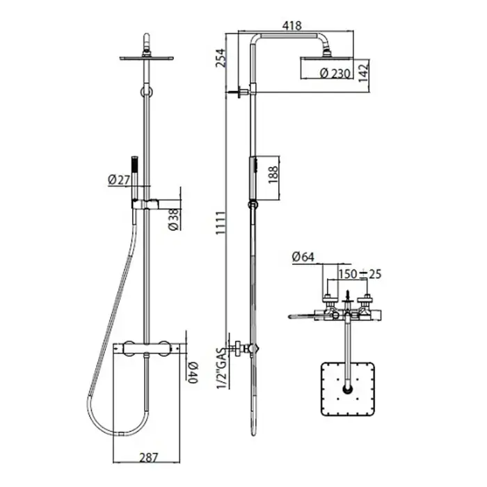 Bossini Cosmo Душевая стойка, с верхним душем 23х23см., с термостатическим смесителем, ручной душ, цвет: черный матовый
