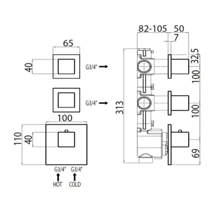 Bossini Cube Термостат для душа, встраиваемый (внешняя часть), с девиаторм/запорным вентилем на 2 - 4 выхода, уст-ка верт/гор., цвет: черный матовый