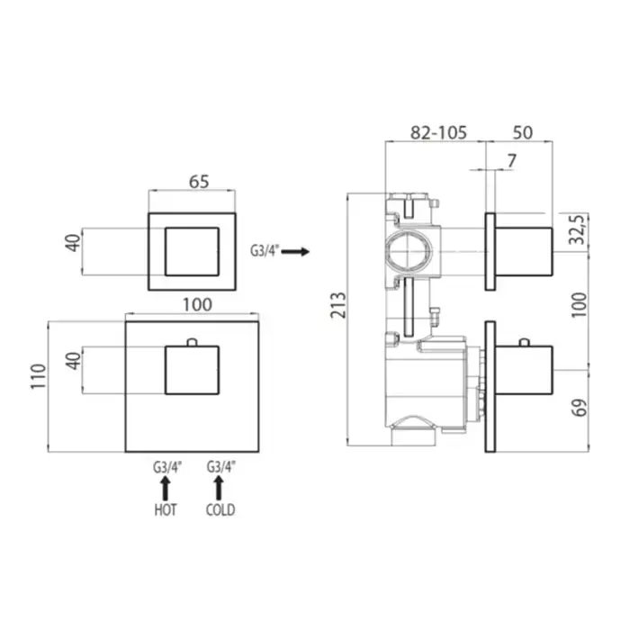 Bossini Cube Термостат для душа, встраиваемый (внешняя часть), с девиаторм/запорным вентилем на 1 или 2 выхода, уст-ка верт/гор., цвет: хром