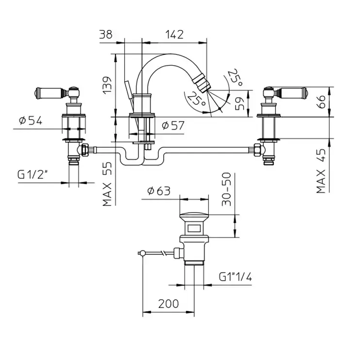 Bossini Liberty Смеситель для биде на 3 отверстия с поворотным изливом и заглушкой 1"1/4, цвет: Brushed bronze matt