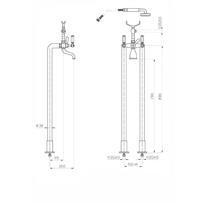 Bossini Liberty Смеситель для ванны, напольный, высота 890 мм, душ лейка Liberty шланг латунь, 150 см ½"FF, цвет: Gold PVD