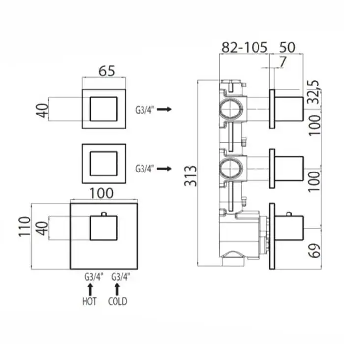 QuadroDesign Универсальная IN050 Встраиваемая часть смесителя термостатического из стены с 3-мя запорными вентилями