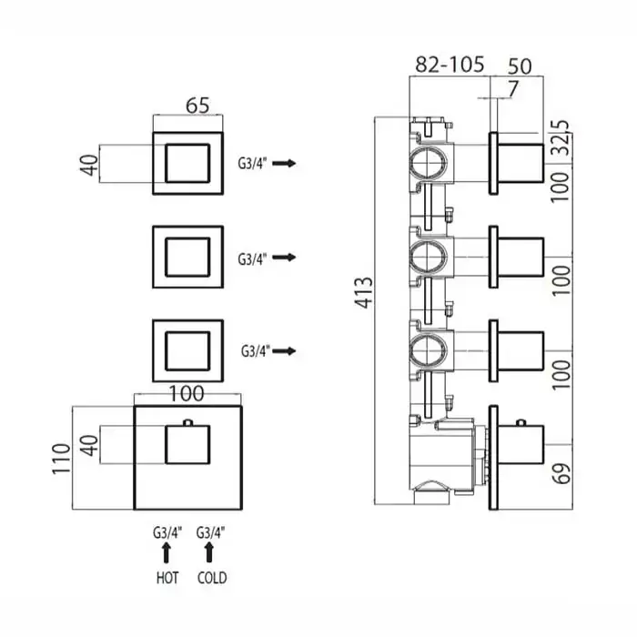 Bossini Встр. часть термостата 3 дивиатора на 2 выхода, (6 выходов) высокой пропускной способности на ¾", уст-ка верт/гор.
