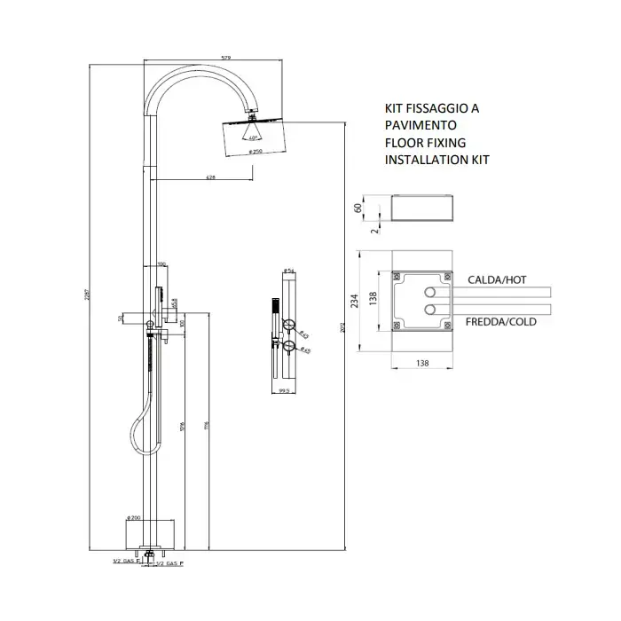 BOSSINI TETIS Душевая колонна для установки вне помещения, напольная, 2 прогрессивн смесителя, верхний душ, ручной душ, с встроенной частью, цвет хром