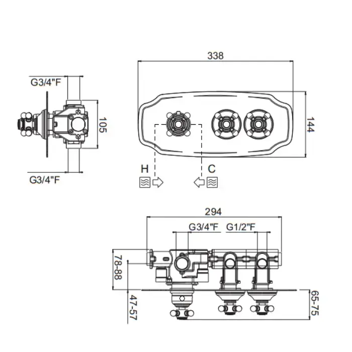 Carimali COLONIAL Внешняя часть горизонтальная термостатического смесителя на 2 потребителя. Colonial пластина and ручки. хром