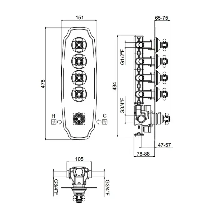 Carimali COLONIAL Внешняя часть вертикальная для термостатического смесителя с 4-ю независимыми выходами, цвет хром