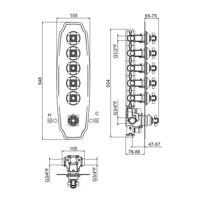 Carimali COLONIAL Внешняя часть вертикальная для термостатического смесителя с 5-ю независимыми выходами, цвет хром