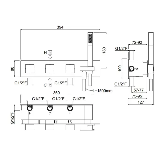 CARIMALI ILQUADRO Смеситель для душа встраиваемый, однорычажный, с переключателем на 4 потока, с ручным душем и шлангом, внешняя часть, цвет хром