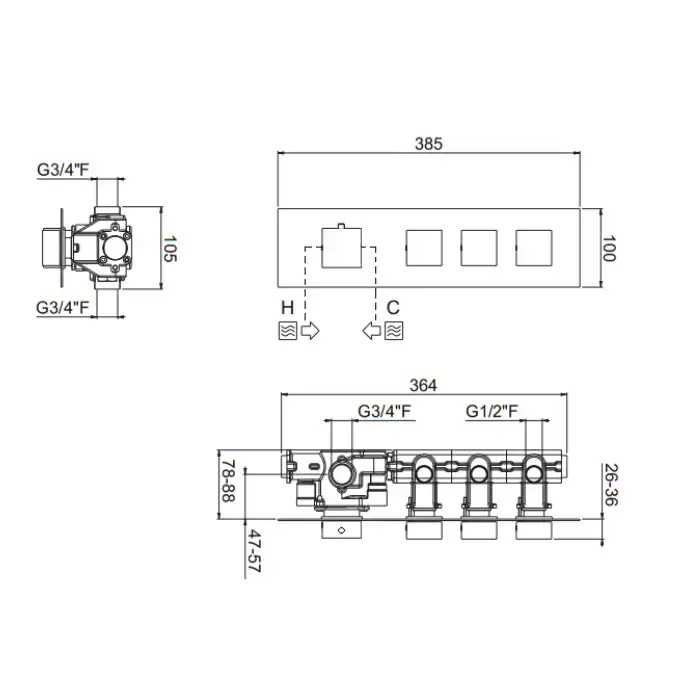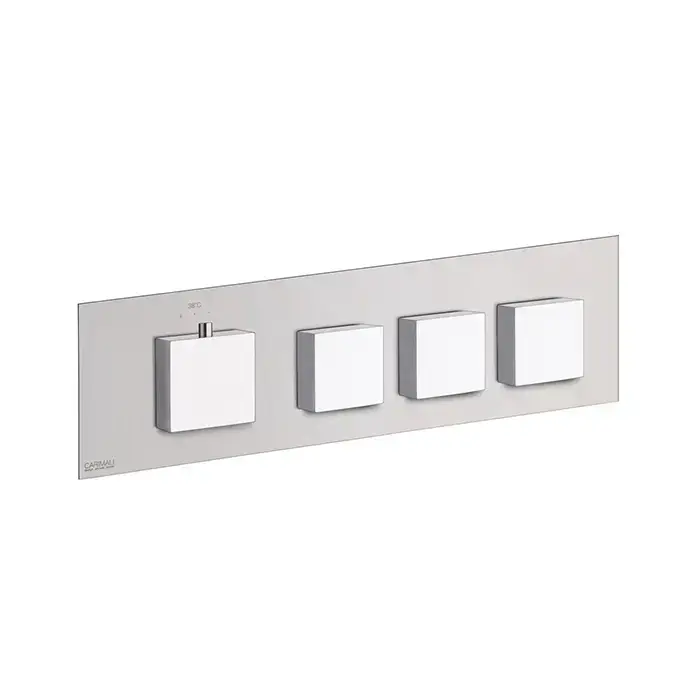 Carimali ILQUADRO Внешняя часть горизонтальная термостатического смесителя на 3 потребителя. Квадратная пластина и ручки. хром