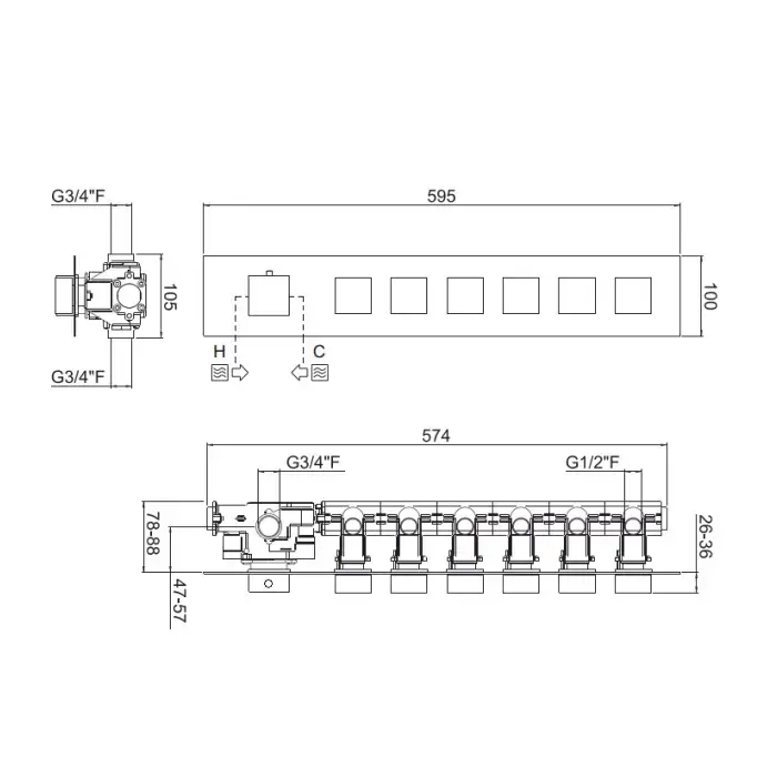 Carimali ILQUADRO Внешняя часть горизонтальная для термостатического смесителя с 6-ю независимыми выходами, цвет хром
