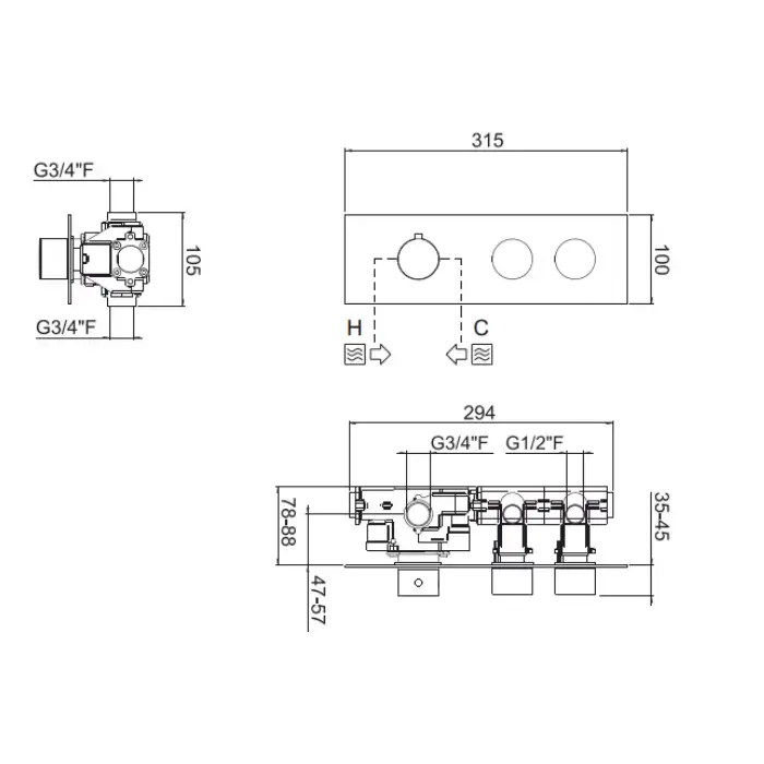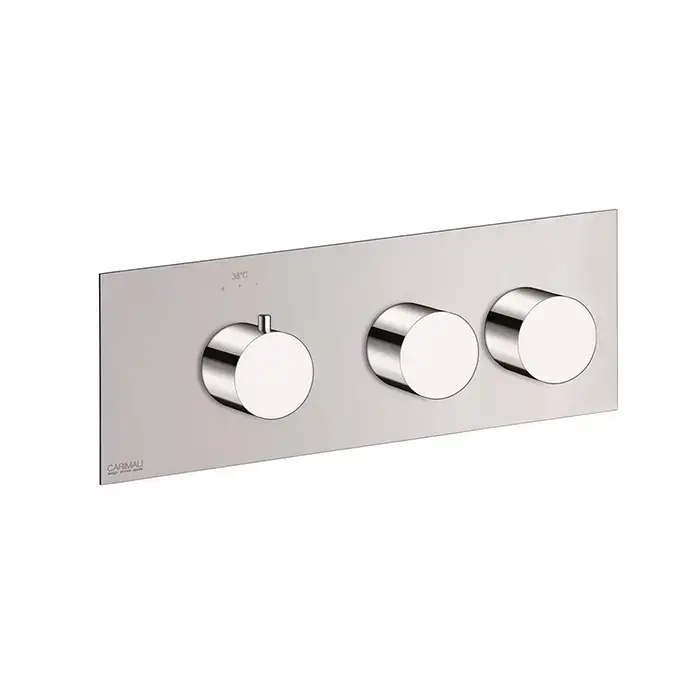 Carimali ILTONDO Внешняя часть горизонтальная термостатического смесителя на 2 потребителя. Квадратная пластина и круглые ручки. хром