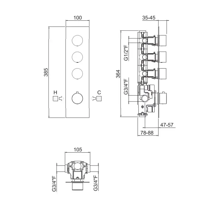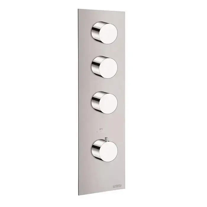 Carimali ILTONDO Внешняя часть вертикальная термостатического смесителя на 3 потребителя. Квадратная пластина и круглые ручки. хром